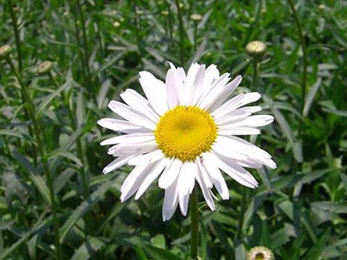 濱菊(Leucanthemum vulgate Lam.)菊科多年生草本,高15-80厘米。莖直立,通常不分枝,被絨毛或卷毛至無毛。基生葉花期生存,長橢圓形、倒披針形、倒卵形或卵形,基部楔形,漸狹成長柄,柄長于葉片自身,邊緣圓或鈍鋸齒。全部葉兩面無毛,腺點不明顯。頭狀花序單生莖頂,有長花梗,或莖生2-5個頭狀花序,排成疏松傘房狀。總苞徑10-20毫米。全部苞片無毛,邊緣白色或褐色膜質。瘦果長2-3毫米,無冠毛或舌狀花瘦果有長達0.4毫米的側緣冠齒。花果期5-10月。